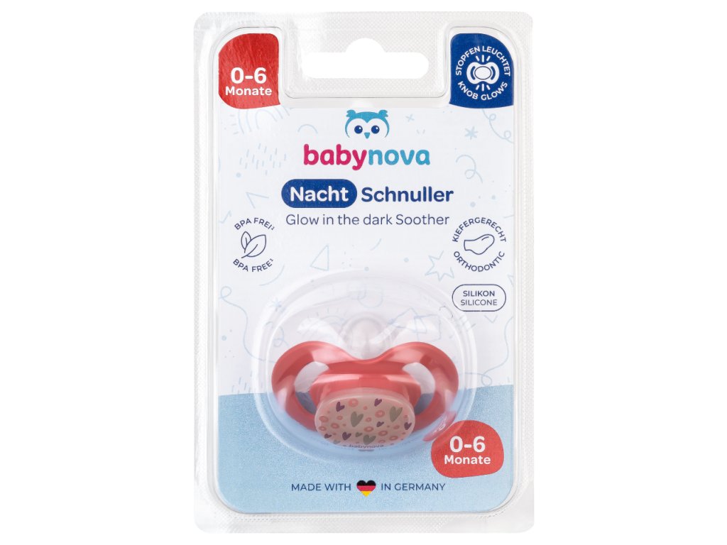 NOČNÝ utišujúci cumlík Baby Nova svieti v tme, aby sa dal ľahko nájsť v noci Utišujúci cumlík šetrný k čeľusti bez krúžku podporuje prirodzený vývoj mliečnych zubov vďaka anatomicky tvarovanému cumlíku. Cumlík je z kvalitného mäkkého a priehľadného silikónu, bez chuti a zápachu.