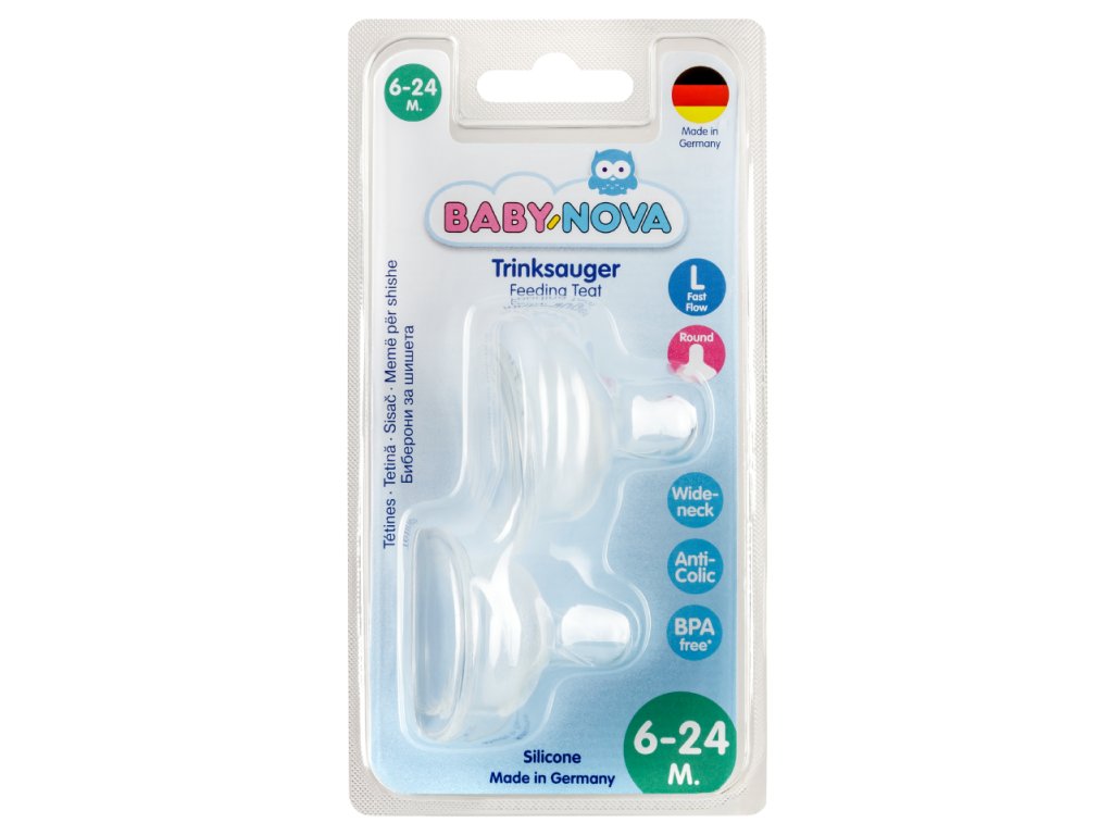 Silikónový univerzálny cumlík Baby Nova je vhodný pre všetky fľaše so širokým hrdlom. Cumlík je dokonale odvetrávaný a počas kŕmenia sa nelepí. Je z vysokokvalitného silikónu. Cumlík nemá žiadnu chuť ani vôňu. Je prispôsobený na opakovanú dezinfekciu.