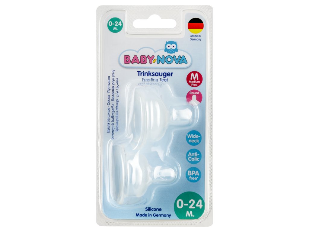 Silikónový univerzálny cumlík Baby Nova je vhodný pre všetky fľaše so širokým hrdlom. Cumlík je dokonale odvetrávaný a počas kŕmenia sa nelepí. Je z vysokokvalitného silikónu. Cumlík nemá žiadnu chuť ani vôňu. Je prispôsobený na opakovanú dezinfekciu.
