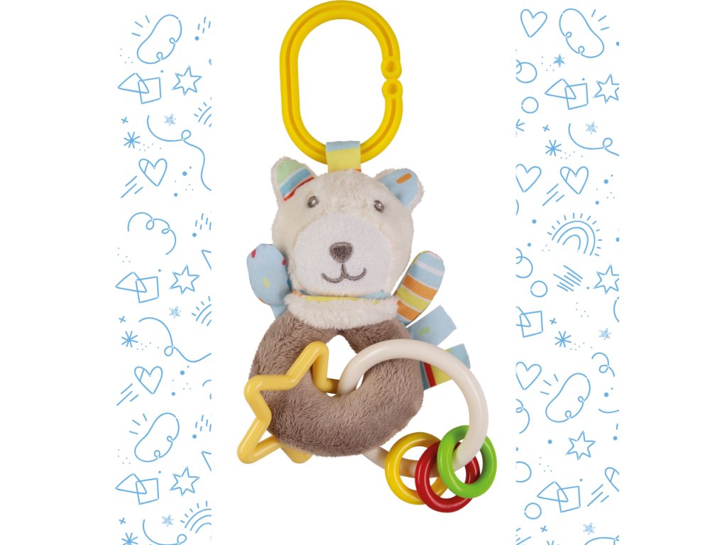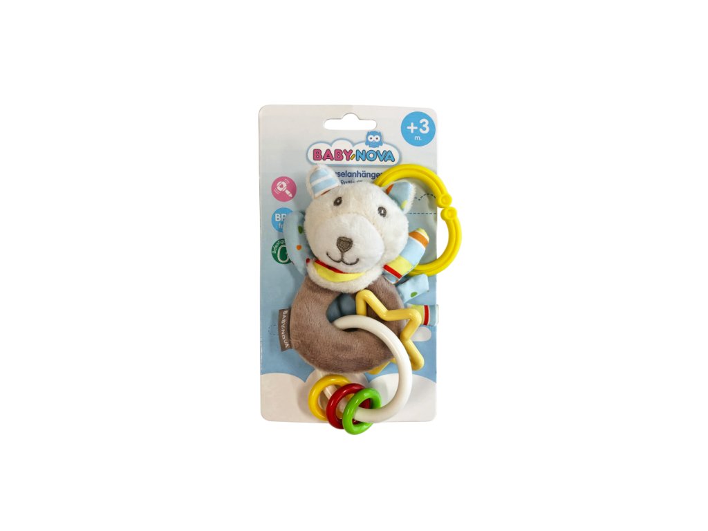 Tento roztomilý plyšový macko z kolekcie hračiek Baby Nova je skvelým kamarátom na hranie, je krásne mäkký a vo vnútri má malú hrkálku. Praktický klip uľahčuje pripevnenie hrkálky na postieľku, detský nosič alebo kočík. Vonkajší materiál je vyrobený z veľmi kvalitného mäkkého velúru. Pre deti od 3 mesiacov.