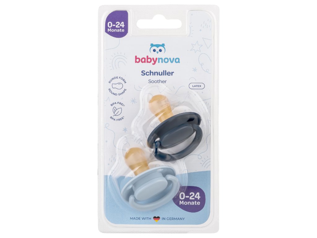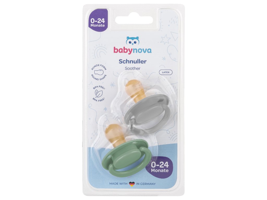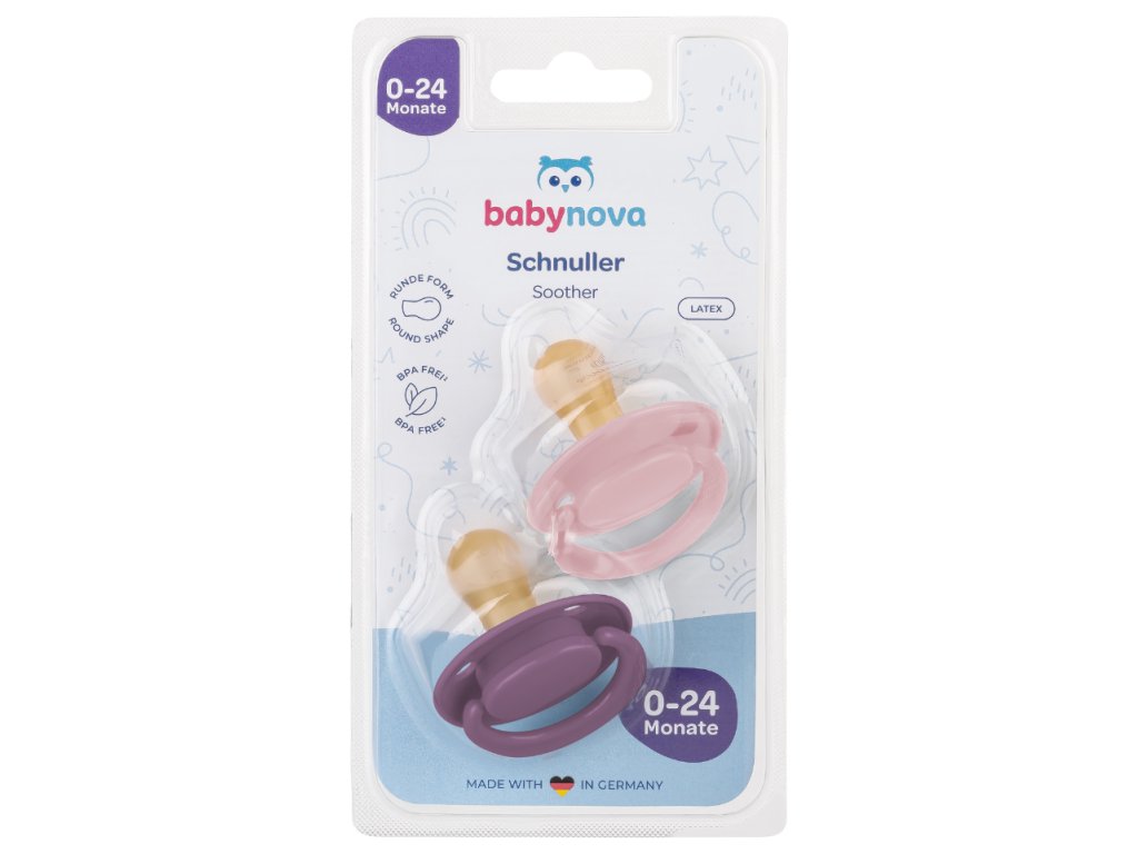 Utišujúci cumlík Baby Nova s okrúhlym tvarovaným cumlíkom je podobný prsiam matky, aby vášmu dieťaťu dodal prirodzený pocit kŕmenia. Cumlík je z kvalitného latexu, bez chuti a zápachu. Má gumený pás s kruhovým tvarom, ktorý zaisťuje voľné dýchanie a prehĺtanie slín. Špeciálne vetracie otvory v kotúči zaručujú správne prúdenie vzduchu a minimalizujú riziko dráždenia pokožky. Pohodlná rukoväť uľahčuje podávanie cumlíka dieťaťu a upevnenie k držiaku cumlíka.