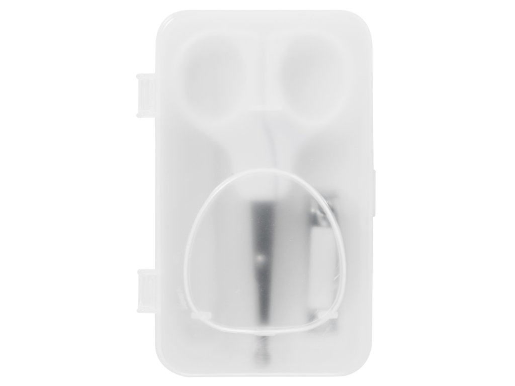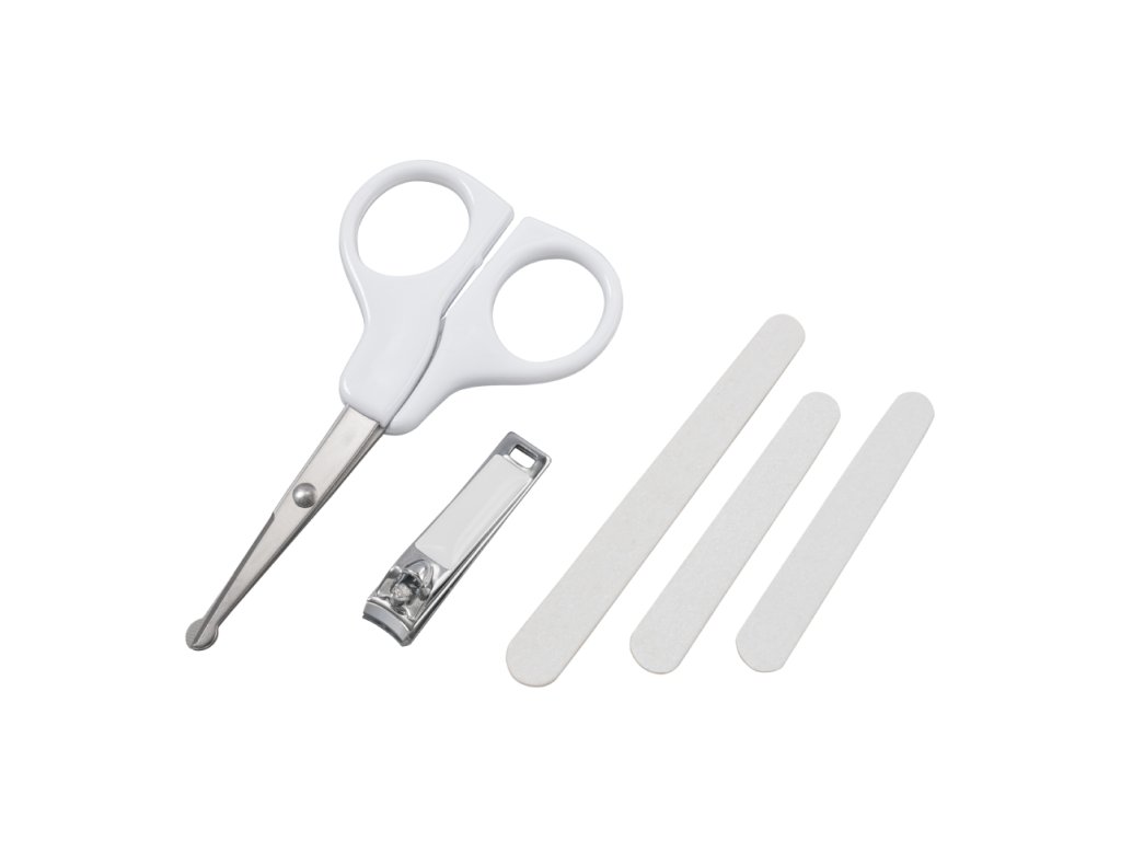 Sada na manikúru pozostávajúca z klieštikov na nechty, pilníka a nožníc so zaoblenými hrotmi. Bezpečne zabalené v úložnom boxe.