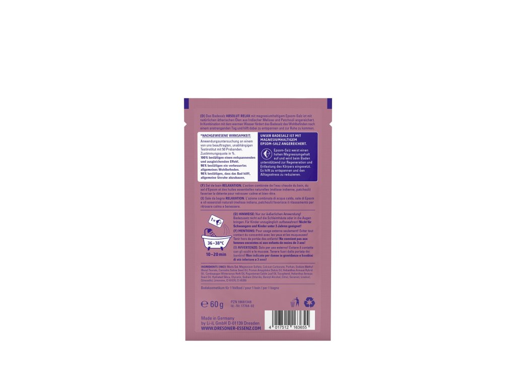 Doprajte si zaslúžený odpočinok po náročnom dni s kúpeľovou soľou **„Absolut Relax“**. Obsahuje horčíkom bohatú epsomskú soľ a je obohatená o prírodné éterické oleje z indickej medovky (citronely) a pačuli. V kombinácii s teplou vodou podporuje celkové uvoľnenie, navodzuje pohodu a prispieva k regenerácii tela aj mysle.