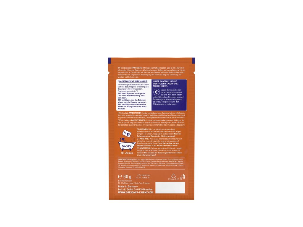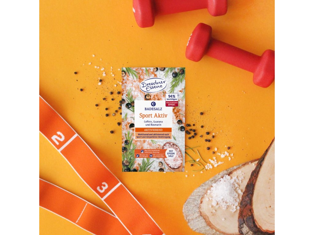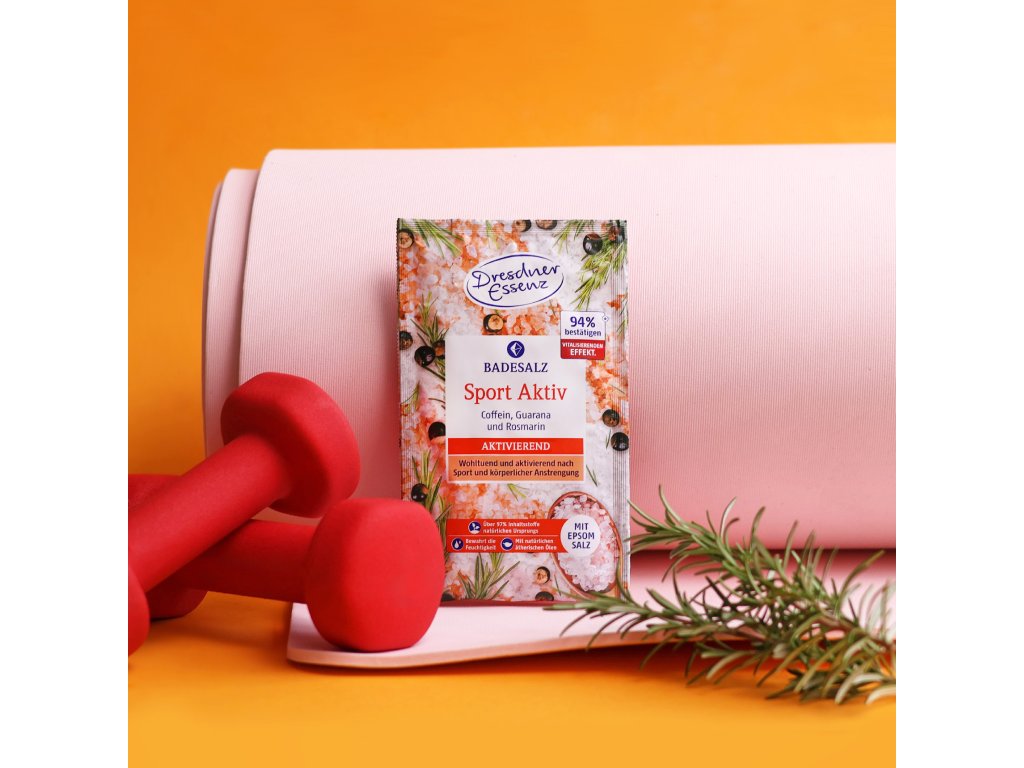 Doprajte svojim svalom uvoľnenie po športe či fyzickej námahe s kúpeľovou soľou **„Sport Aktiv“**. Obsahuje horčíkom bohatú epsomskú soľ a je obohatená o prírodné éterické oleje z rozmarínu, mäty a wintergreenu. Kofeín a guarana podporujú prekrvenie, zatiaľ čo mandľový a slnečnicový olej dodávajú pokožke jemnosť a výživu. V kombinácii s teplou vodou pomáha uvoľniť svalové napätie a prináša pocit regenerácie a vitality.