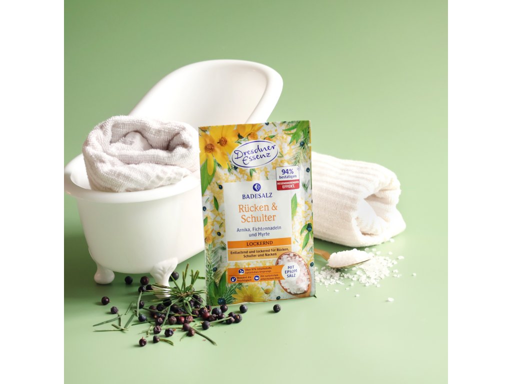 Uvoľňujúca soľ do kúpeľa **„Ruky & Plecia“** s magnéziovou Epsom soľou je obohatená o prírodné éterické oleje z myrty a smrekových ihličiek a o cenný arnikový extrakt. V kombinácii s teplou vodou pôsobí odľahčujúco a vyrovnávajúco, pomáha uvoľniť napätie a podporuje celkovú pohodu chrbta, pliec a šije.