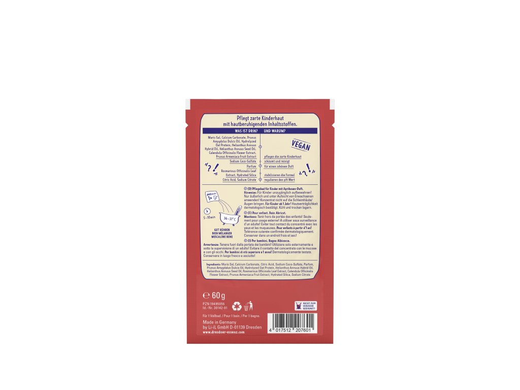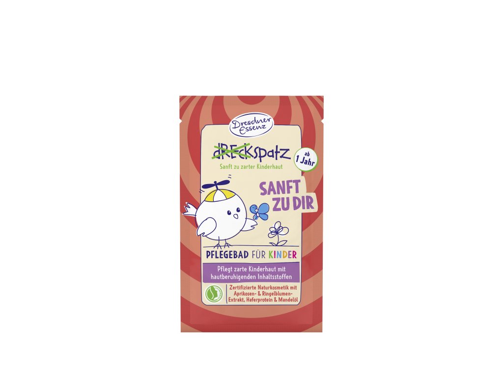 Kúpeľ **„Sanft zu dir“** jemne ošetruje detskú pokožku vďaka upokojujúcim zložkám. Jemná vôňa marhule obklopí vaše dieťa nežnou arómou a postará sa o príjemný zážitok z kúpeľa. Špeciálny ošetrujúci komplex s extraktom z nechtíka, marhule a ovseným proteínom chráni citlivú pokožku a zároveň ju šetrne čistí. Ideálny pre kúpeľ, ktorý zanechá detskú pokožku hebkú a vláčnu.