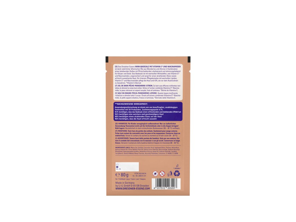 Aktívna soľ do kúpeľa Dresdner Essenz s *vitamínom C* a *niacínamidmi* pôsobí revitalizačne a povzbudzujúco na telo i myseľ vďaka prírodným éterickým olejom z mandarínky a citróna v kombinácii s osviežujúcou vôňou s jemným nádychom broskyne. Soľ do kúpeľa je obohatená o cenné aktívne látky, ako *vitamín C* a niacínamidy, ktoré dodávajú pokožke svieži vzhľad a žiarivý jas. Intenzívny ošetrujúci komplex s lipidmi, *vitamínom C* a niacínamidmi pokožku vyživuje a pomáha ju chrániť pred vysušovaním.
