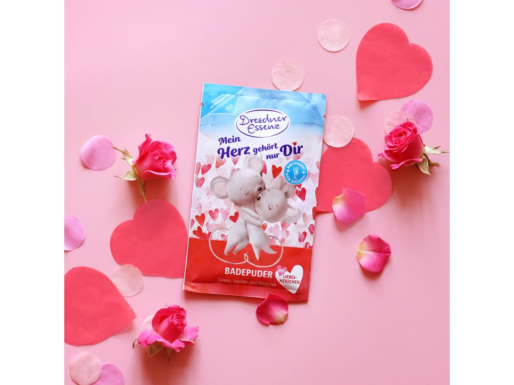Kúpeľový púder *MEIN HERZ GEHÖRT NUR DIR* je dokonalým rituálom pre zamilované srdcia, ktoré hľadajú spoločné chvíle oddychu a blízkosti. Nechaj sa očariť romantickou atmosférou, ktorú toto kúpeľové púdrové soli vytvárajú vo vani – s ovocno-sladkou vôňou čiernych ríbezlí, vanilky a orchidey, doplnenou o malé srdiečka lásky.