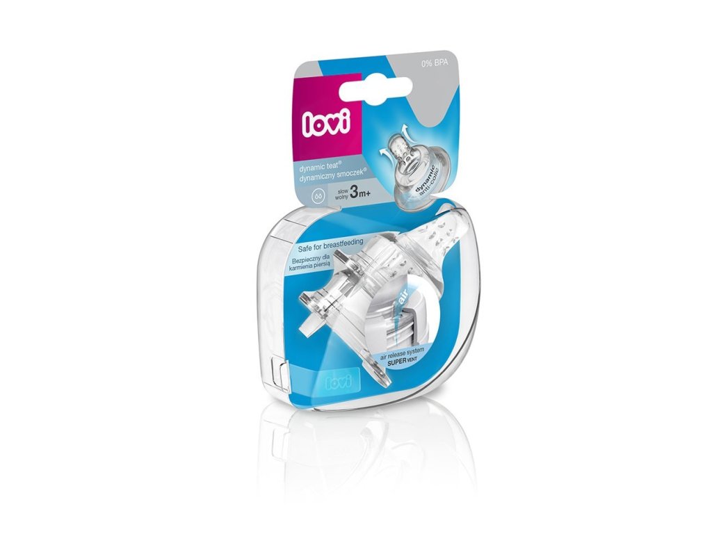 Lovi dynamický cumlík Super Vent pre podávanie odsatého materského mlieka je výsledkom práce lekárov - neurologopédov. Je vyrobený z heterogénnych vrstiev silikónu a v priebehu kŕmenia modifikuje svoj tvar a prispôsobuje sa rytmu a sile satia dieťaťa. Preto nenarušuje sací reflex dieťaťa a kombináciu kŕmenia a dojčenia.