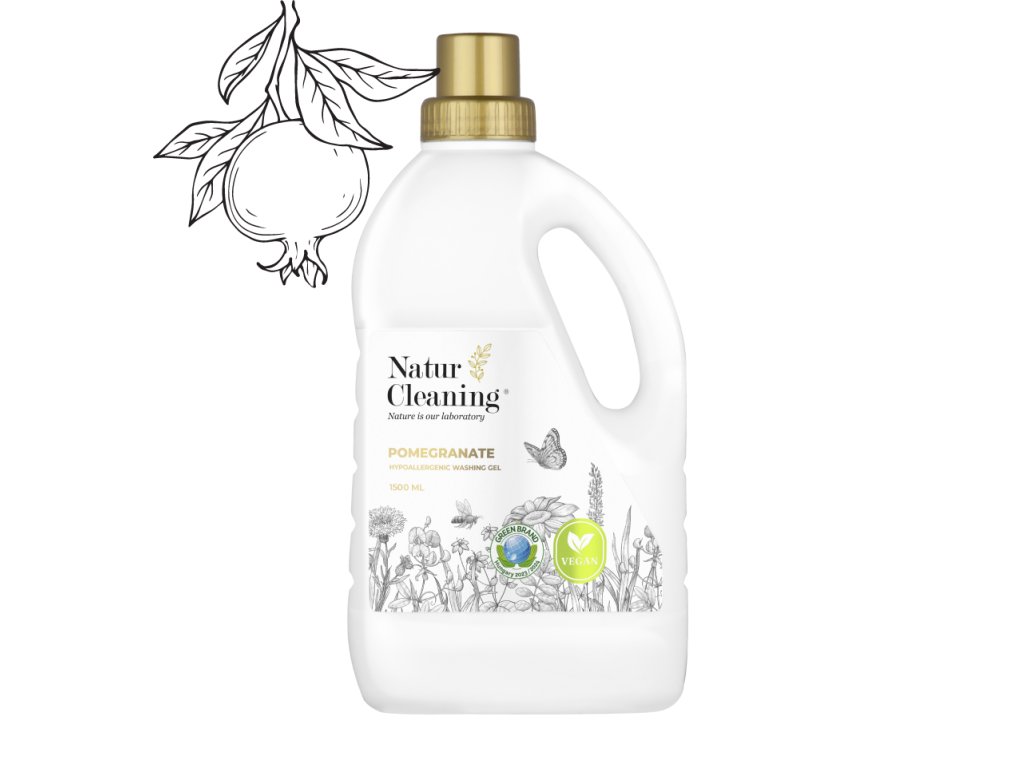 Prací gél Naturcleaning Pomegranate pomáha zachovať farbu oblečenia, či už ide o farebné alebo svetlé tkaniny. Ocenený značkou Green Brand.