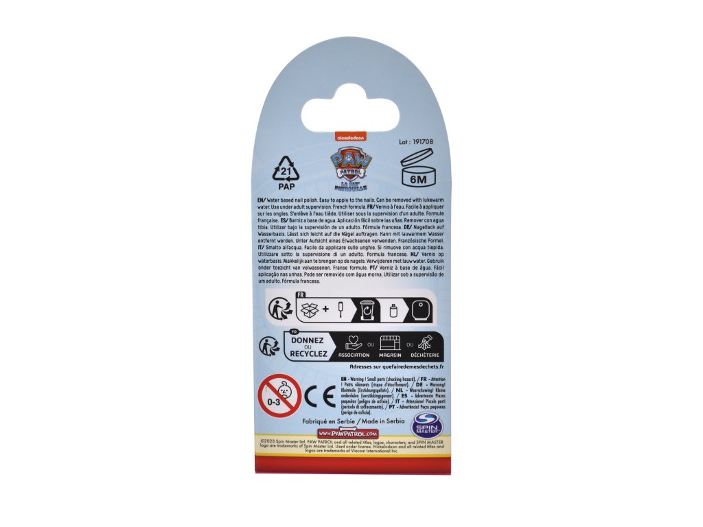 PAW Patrol prináša zábavu aj do detského manikúrneho kútika 🌸. Tento vodový lak na nechty je špeciálne vyvinutý pre deti – je netoxický, bezpečný a dá sa jednoducho zmyť vodou 🚿 bez použitia odlakovača. V balení navyše čaká malý prekvapivý darček 🎁 – roztomilý prsteň, ktorý urobí radosť každej malej parádnici 👧. S obľúbenými hrdinami z PAW Patrol 🐾 sa každé lakovanie premení na veselú hru.