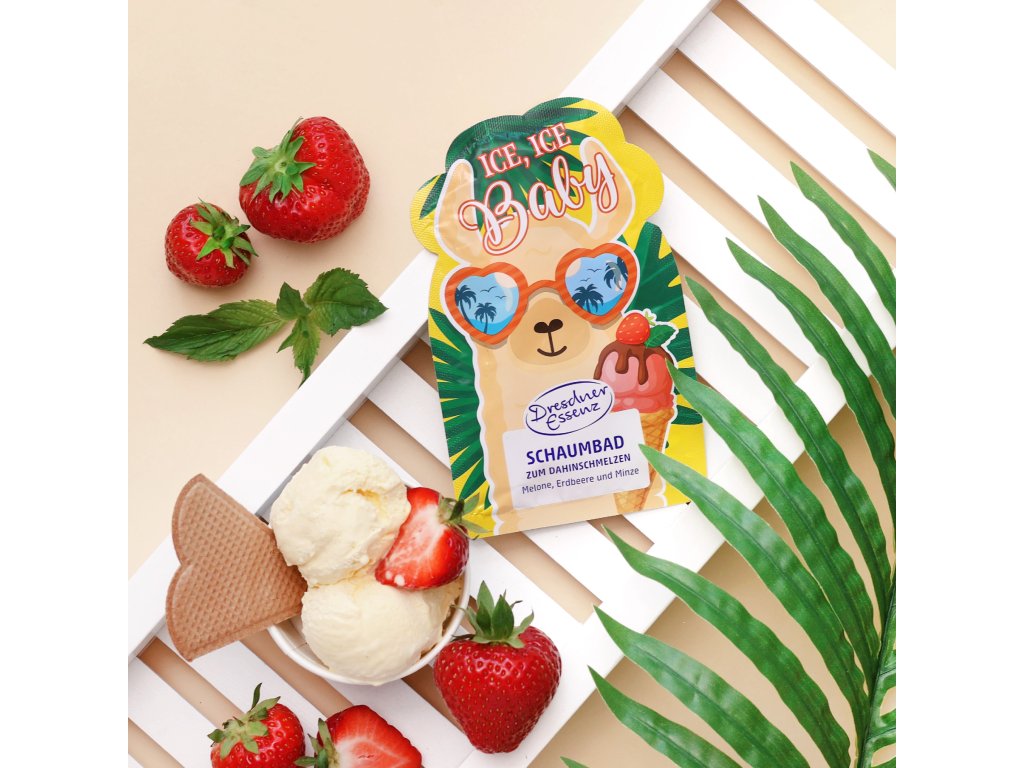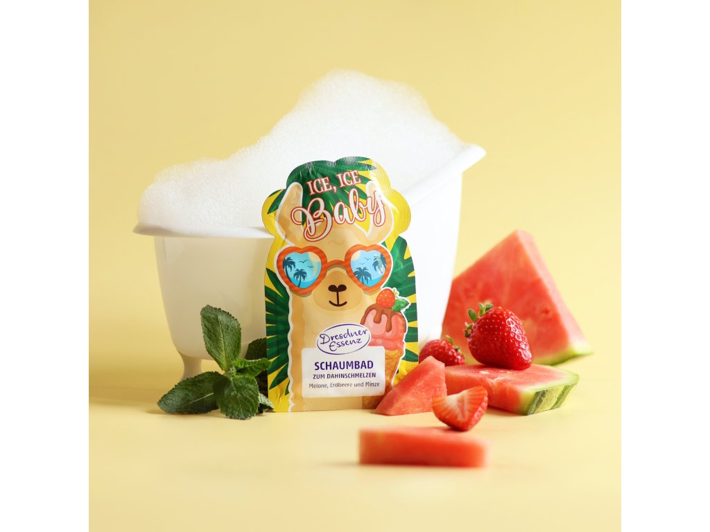 Šumivý kúpeľ *ICE, ICE BABY* s ovocno-sviežou vôňou melónu, jahody a mäty je vaša malá prestávka na roztopenie stresu.