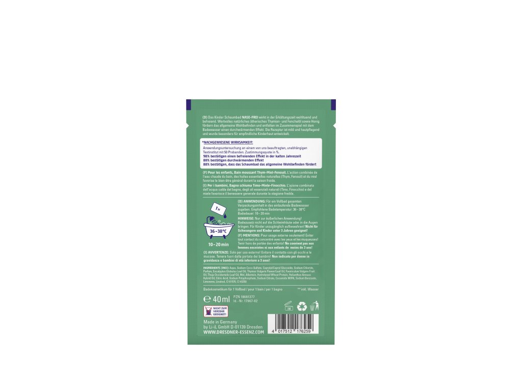 Špeciálne vyvinutý pre deti počas nádchy – jemná pena s prírodnými olejmi z tymiánu a feniklu uvoľňuje dýchacie cesty a pomáha deťom ľahšie dýchať.