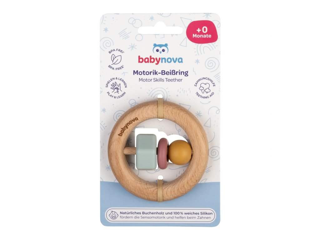 Drevený motorický krúžok na hryzenie Baby Nova s farebnými silikónovými tvarmi je zároveň vzdelávacou hračkou a krúžkom na hryzenie. Kombinácia pohyblivých silikónových prvkov a prírodného bukového dreva hravou formou podporuje motorické a senzorické zručnosti. Ľahko uchopiteľný drevený krúžok môže mať pri prerezávaní zúbkov účinok na zmiernenie bolesti. Všetky použité materiály sú stálofarebné a neškodné.