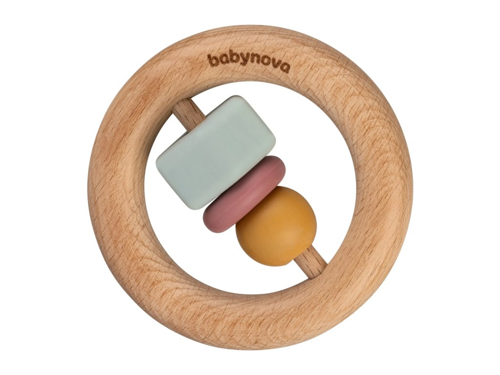 Drevený motorický krúžok na hryzenie Baby Nova s farebnými silikónovými tvarmi je zároveň vzdelávacou hračkou a krúžkom na hryzenie.