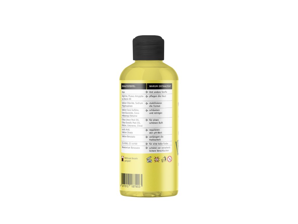 Aqua, Sodium Coco-Sulfate, Coco-Glucoside, Cocamidopropyl Betaine, Sodium Chloride, Citrus Limon Peel Oil, Citrus Grandis Peel Oil, Arginine, Prunus Amygdalus Dulcis Oil, Lactic Acid, Sodium Polyphosphate, Sodium Citrate, Denatonium Benzoate, Sodium Benzoate, Parfum, Limonene, Citral, CI 47005, CI 14700