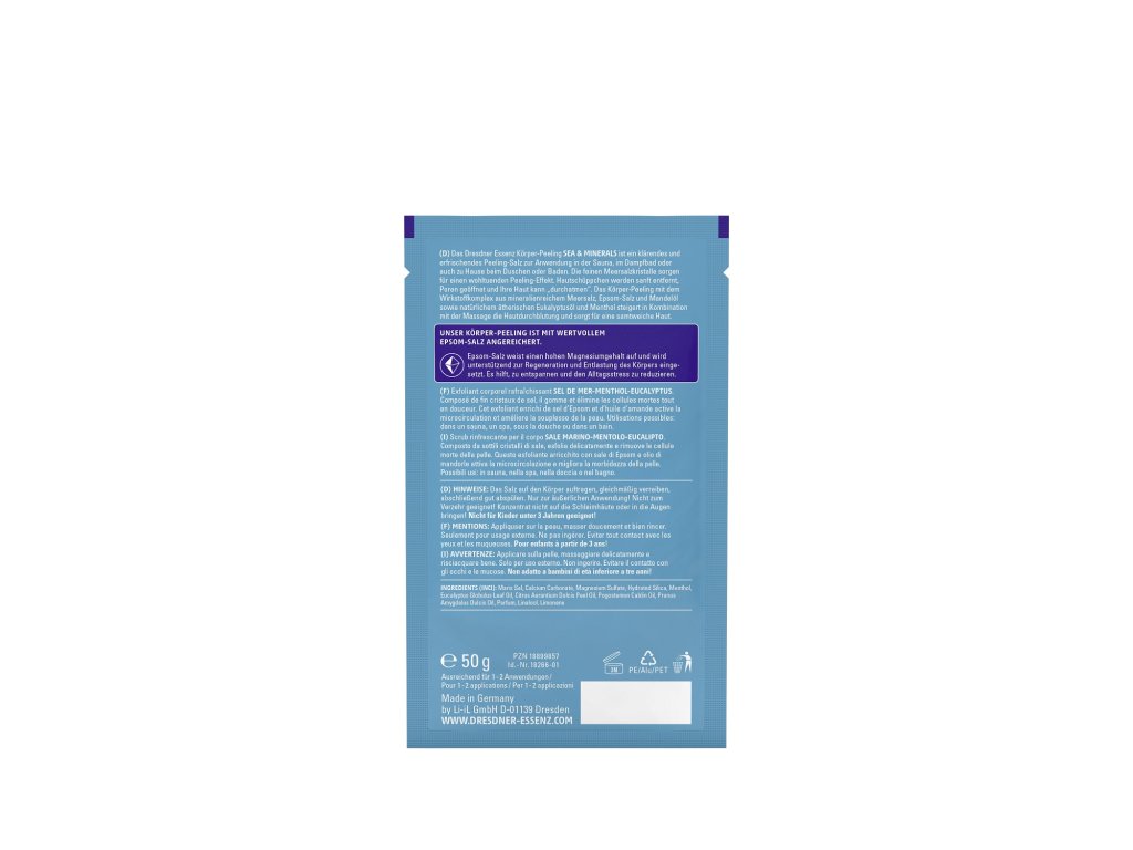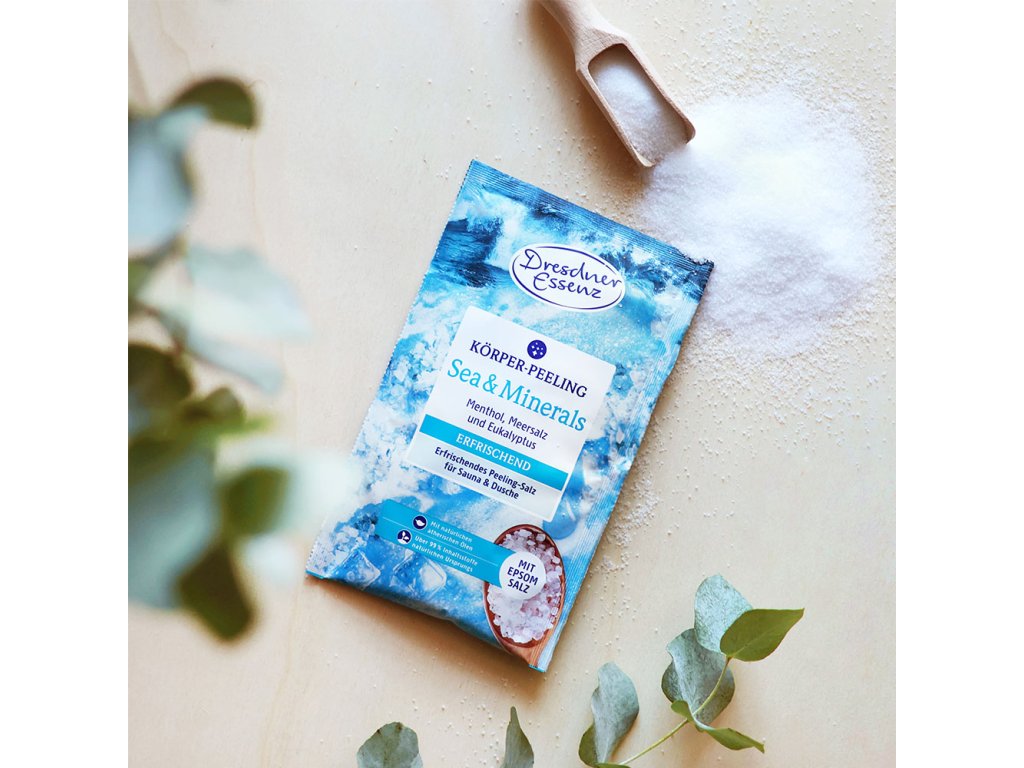 Peeling s komplexom účinných látok pozostávajúcim z minerálmi bohatej morskej soli, soli Epsom, mandľového oleja a prírodného eukalyptového oleja s mentolom v kombinácii s masážou zlepšuje prekrvenie pokožky a zanecháva ju zamatovo jemnú.
