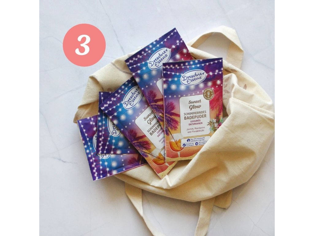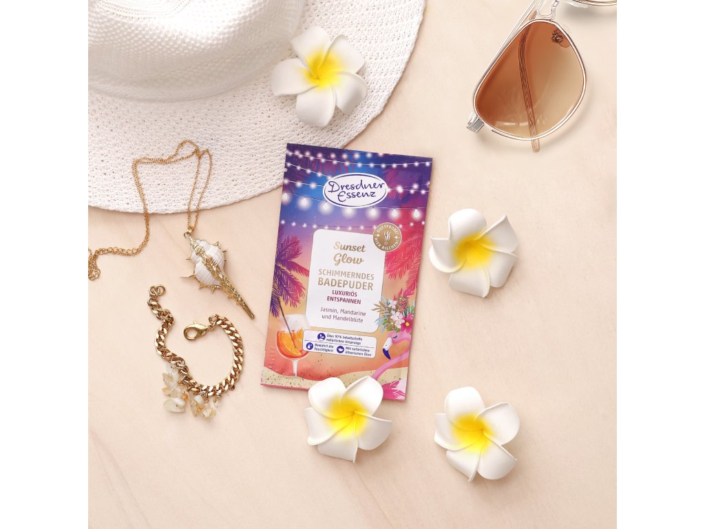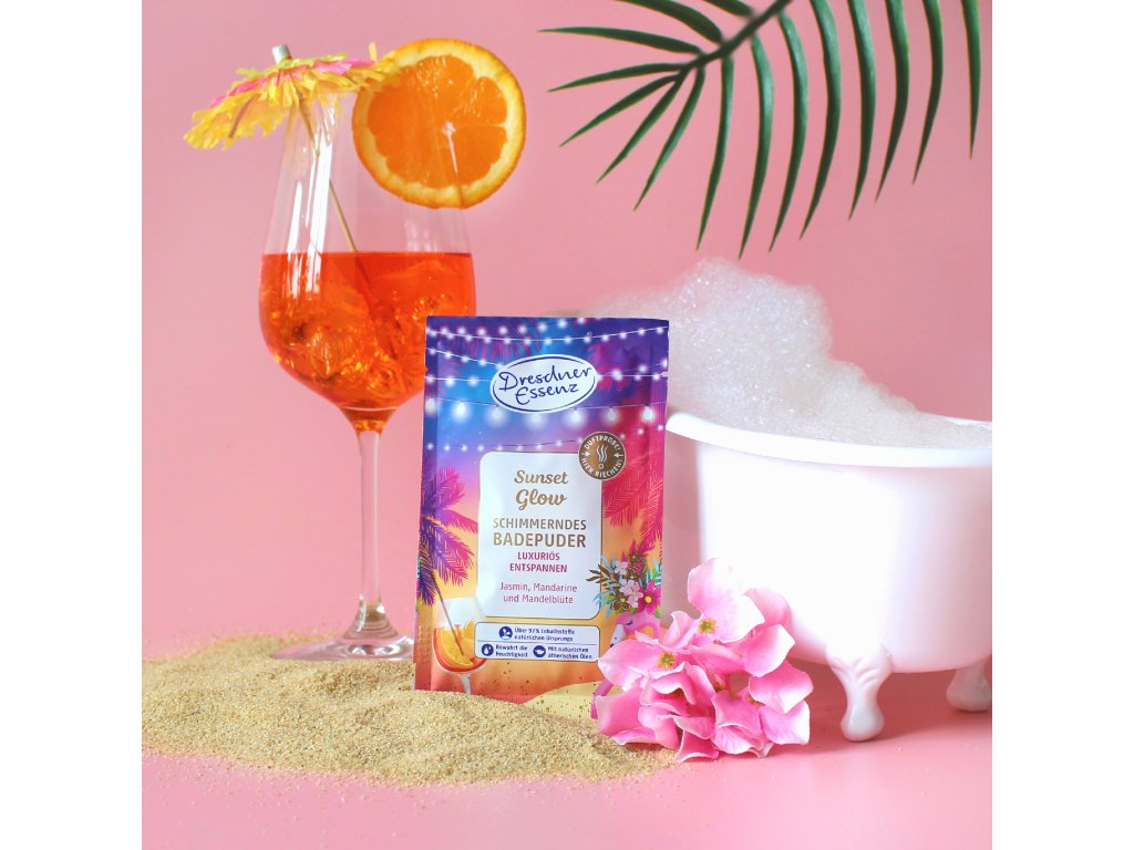 Trblietavý kúpeľový prášok Západ slnka (jazmín – mandarínka – mandľový kvet) s očarujúcou vôňou jazmínu, mandarínky a mandľového kvetu, v kombinácii s prírodnými éterickými olejmi z pomaranča a mandarínky a trblietavými čiastočkami glitru, ti umožní luxusne sa zrelaxovať a dodá pokožke žiarivý lesk.