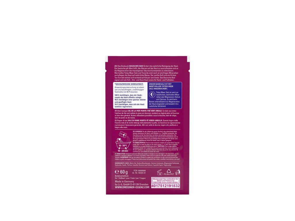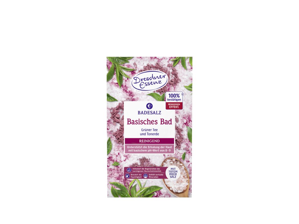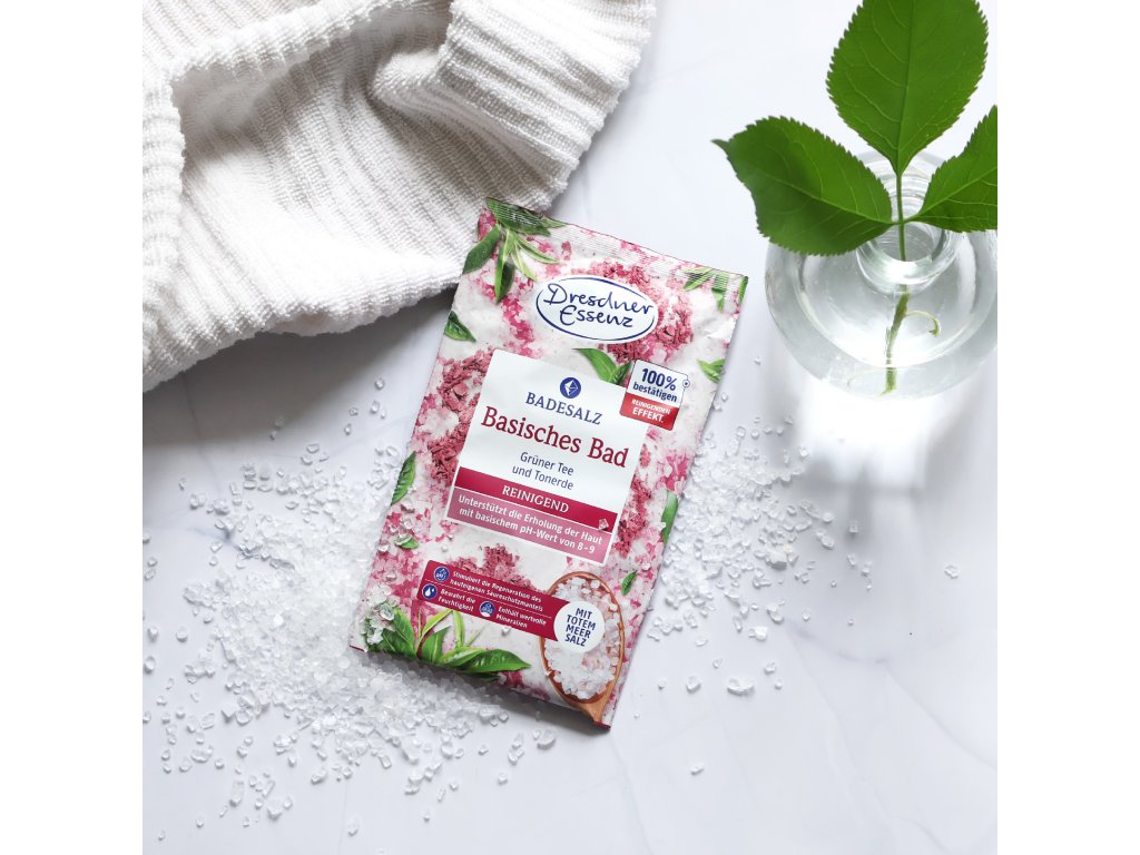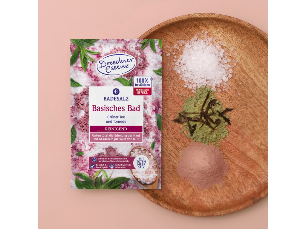 Zásaditá kúpeľová soľ* podporuje prirodzené čistenie pokožky. Bazická hodnota pH pomáha neutralizovať kyseliny na pokožke a tým stimuluje regeneráciu jej prirodzeného ochranného kyslého plášťa. Vzácna soľ z Mŕtveho mora a íl sú bohaté na dôležité minerály a prirodzene ošetrujú pokožku. Soľ z Mŕtveho mora obsahuje cenné minerály ako horčík, draslík a vápnik, ktoré podporujú regeneráciu pokožky a zachovávajú jej prirodzenú krásu. Jemná vôňa a extrakt zo zeleného čaju pôsobia osviežujúco na telo aj dušu. Bazický kúpeľ je vhodný ako celkový, sedací alebo sprchový kúpeľ, ako aj na kúpele rúk a nôh.